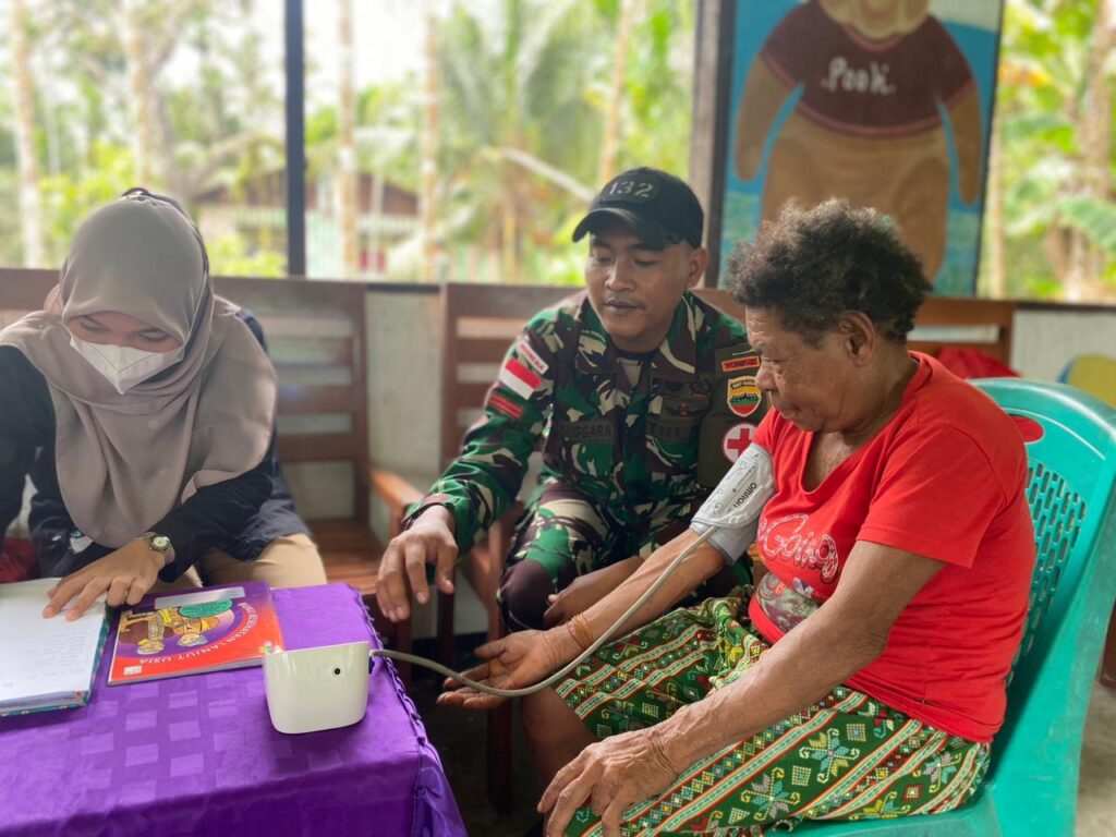 Kab.Keerom – Satgas Yonif 132/BS Pos Arsokota dan Puskesmas Arso menggelar kegiatan pelayanan kesehatan melalui kegiatan Pos Pembinaan Terpadu (Posbindu) Di Kp.Arsokota, Distrik Arso, Kab.Keerom, Provinsi Papua, Minggu (26/02/2023).