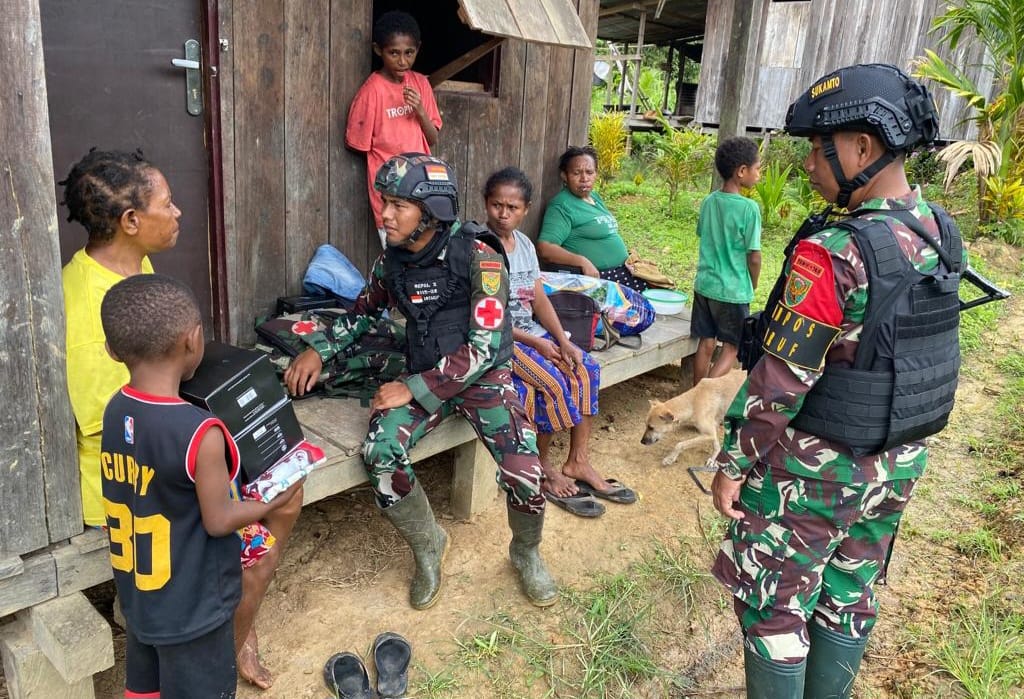“Sebagai wujud perhatian Satgas, kami bagikan warga pakaian layak pakai, bahan makanan dan kesehatan kepada warga Jifangry,” tambah Danpos.