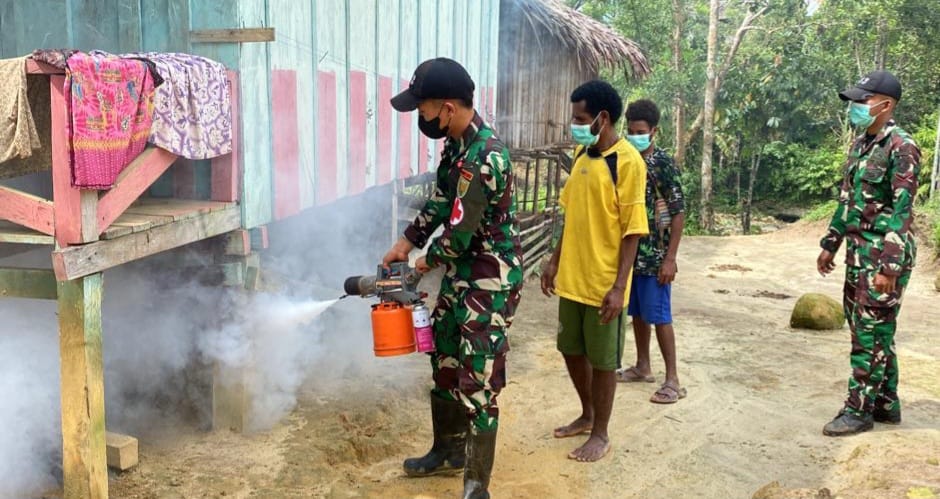 “Sebagai wujud perhatian Satgas terhadap kesehatan warga masyarakat kami laksanakan koordinasi dengan Kepala Kampung untuk memberikan Fogging dalam rangka memberantas penyebaran penyakit Malaria”, ungkap Lettu Inf Michael.