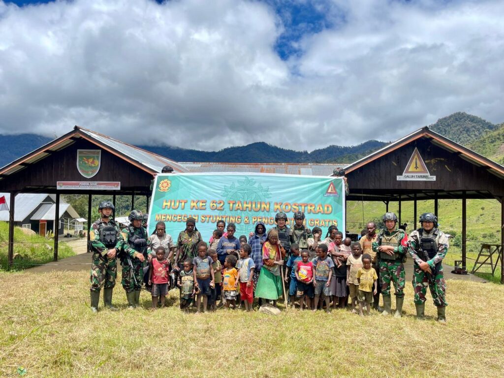 Dalam rangka HUT ke-62 Kostrad, Satgas Yonif Raider 321/GT/13/1 Kostrad adakan penanganan “Papua Bebas Stunting” dengan tema “Satgas Yonif Raider 321/GT/13/1 Kostrad peduli gizi” bertempat di Distrik Mbua, Kabupaten Nduga, Papua.