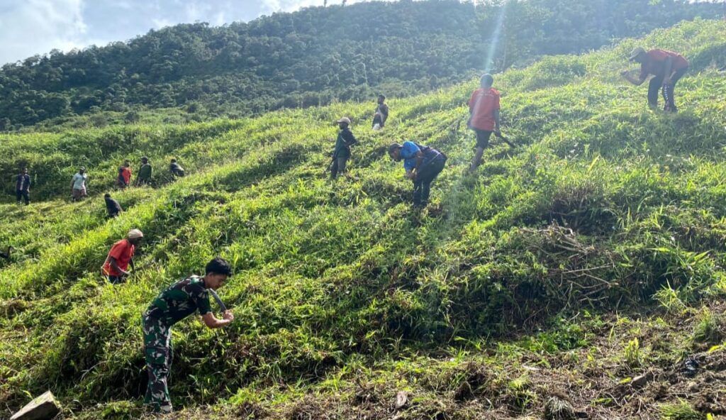 Pegunungan Bintang – Dalam rangka mempererat komunikasi, menjaga kebersihan dan keindahan lingkungan, Satgas Yonif 143/TWEJ bersama warga melaksanakan Karya Bakti di Kampung Abmisibil, Distrik Okbibab, Kab. Pegunungan Bintang, Papua, Kamis (23/03/2023).