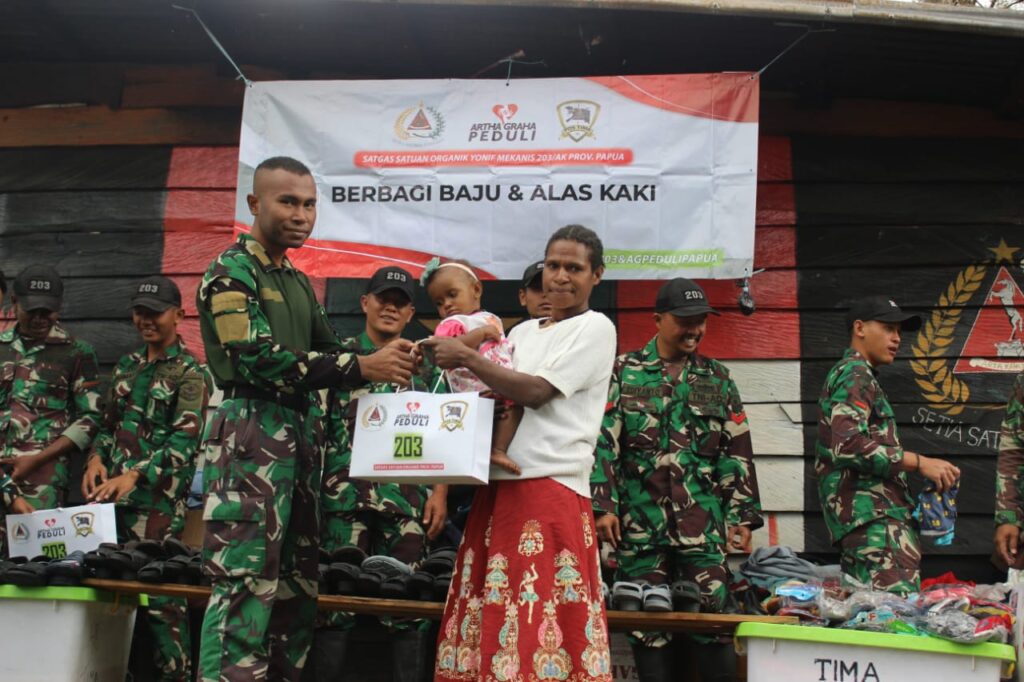 Di dalam menyambut bulan yang penuh berkah ini Pos Tima Satgas Yonif Mekanis 203/AK bekerja sama dengan Artha Graha membagikan baju layak pakai dan sandal serta sepatu kepada masyarakat Desa Tima, Distrik Balingga Kab. Lanny Jaya.(25/03/2023)