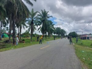 Kab.Keerom - Satgas Pamtas RI-PNG Yonif 132/BS bersama masyarakat desa Workwana menggelar karya bakti membersihkan sepanjang jalan yang ada di...
