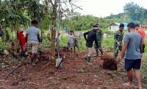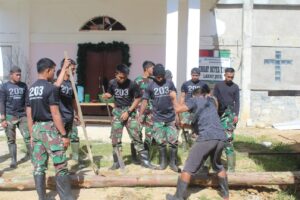 Personel Pos Kotis Satgas Yonif Mekanis 203/AK dan anggota Koramil Tiom serta Polres Lanny Jaya melaksanakan Karya Bhakti bersama dengan...