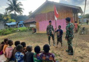 Pegunungan Bintang - Personel TNI Pos Kawe Satgas Yonif 143/TWEJ bersama anak -anak taman belajar melaksanakan latihan upacara bendera bertempat...