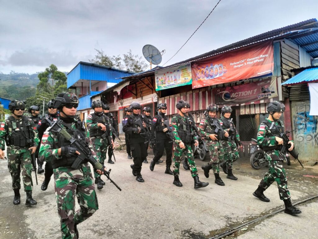 Tolikara, ~ Demi terus menjaga situasi agar tetap kondusif dan mengantisipasi isu Profokatif dan aksi susulan dampak kejadian Wamena, Satgas Yonif Raider 142/KJ bersinergi dengan aparat kemanan setempat melakukan Apel dan patroli Gabungan TNI Polri Kabupaten Tolikara, bertempat di Pertigaan Jalan Irian Depan Gereja Yerusalem, Distrik Karubaga, Kabupaten Tolikara, Provinsi Papua Pegunungan, Rabu (8/3/2023)