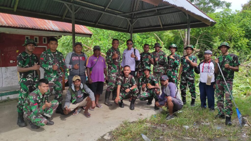 Keerom – Prajurit TNI dari Satuan Kompi Senapan A Yonif 756/WMS mengajak masyarakat melaksanakan karya bakti pembersihan lingkungan yaitu pembersihan salah satu fasilitas publik halte bus yang berada di jalan Arso 1 Distrik Arso Barat, Kab. Keerom, pada Rabu (1/03/2023).