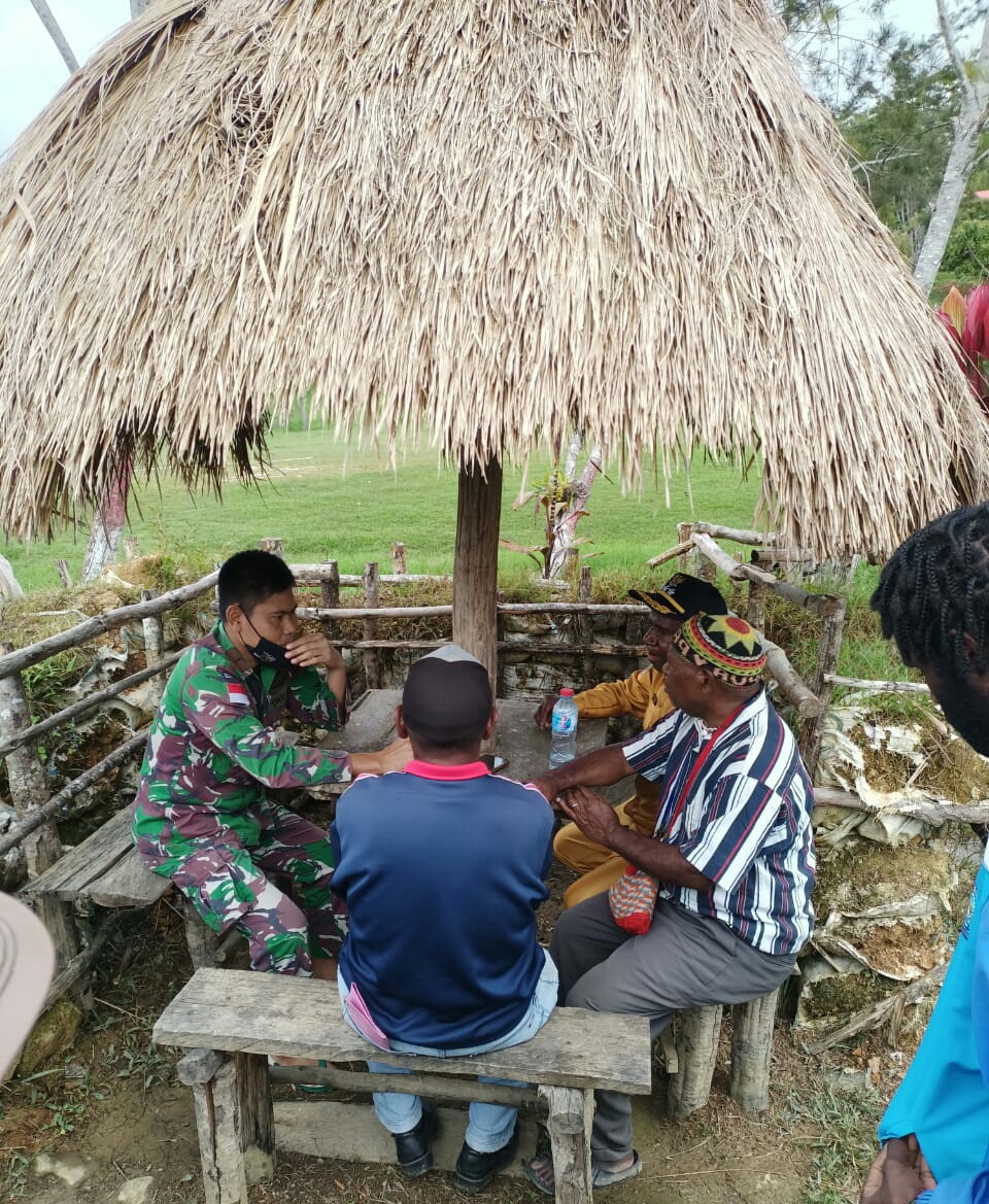 Mamberamo Tengah ~ Satgas Yonif Raider 142/KJ Pos Eragayam menerima kunjungan bapak Kepala Distrik Eragayam dan warga masyarakat di pos Satgas Distrik Eragayam, Kabupaten Mamberamo Tengah, Papua Pegunungan, Senin (27/03/2023).