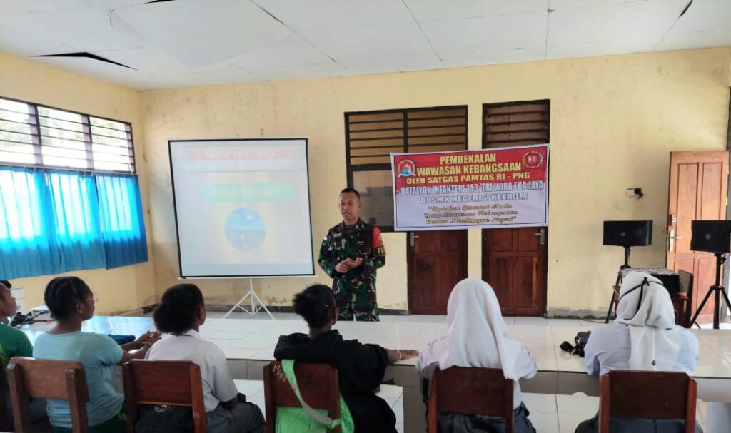 Keerom – Dalam rangka menumbuhkan kesadaran dan pengetahuan Bela Negara Satgas Yonif 143/TWEJ ber pembekalan tentang Wawasan Kebangsaan kepada para siswa SMKN 2 Keerom di Kampung Senggi, Distrik Senggi, Kab. Keerom, Papua, Selasa (21/03/2023).