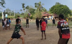 Keerom - Satgas Yonif 143/TWEJ Pos Bompay menjadikan olahraga menjadi sarana efektif untuk berkomunikasi dengan warga di samping bugar melalui...