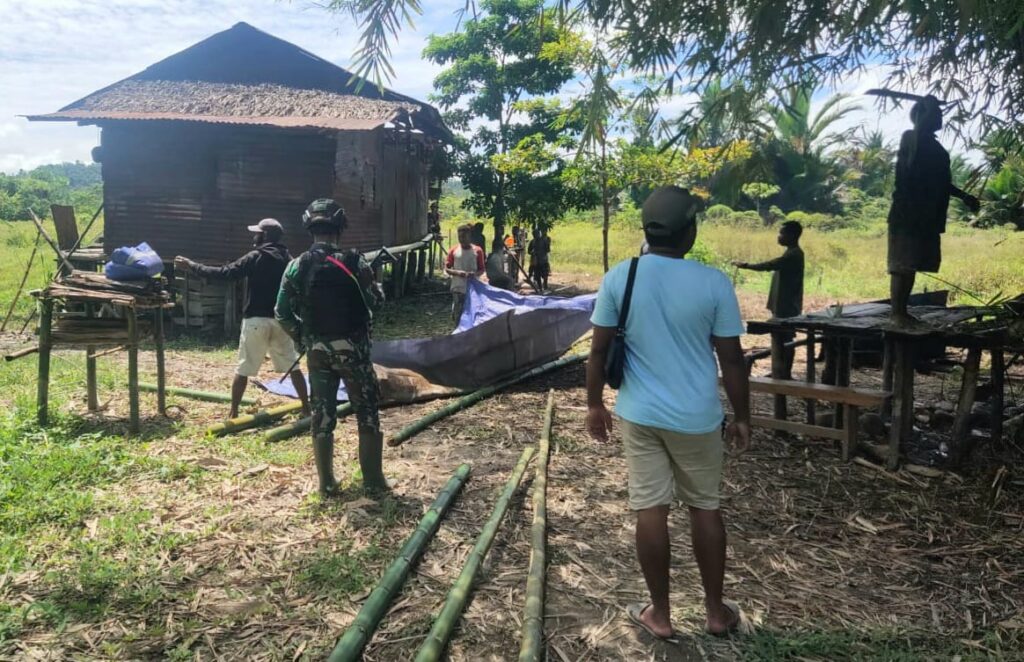 Saat tiba di rumah duka anggota Satgas Yonif 143/TWEJ yang dipimpinbSerda Rizky Lailal tanpa ragu segera membaur bersama warga menyiapkan keperluan pemakaman yang rencananya jenazah akan dimakamkan di tempat pemakaman umum Kampung Batom II.