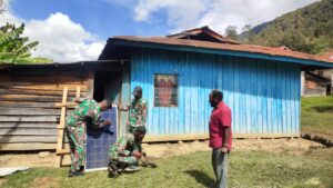 Personel Pos Balingga Satgas Yonif Mekanis 203/AK memberikan lampu dan solar cell untuk masyarakat guna membantu penerangan warga pada malam...