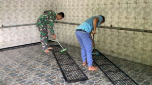 Kab.Keerom - Satgas Yonif 132/BS bersama masyarakat bergotong royong membersihkan masjid yang akan digunakan untuk menyambut Hari Raya Idul Fitri...