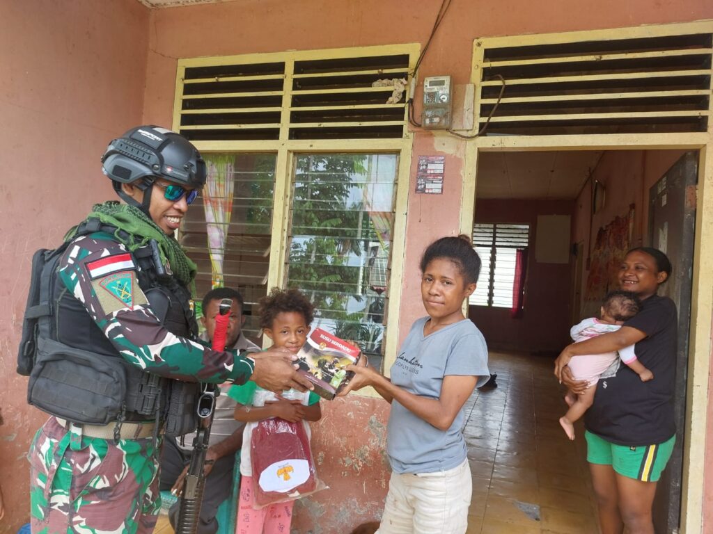 Kab.Keerom – Dalam rangka meningkatkan semangat belajar anak-anak yang tinggal di perbatasan RI-PNG, Satgas Yonif 132/BS bagikan seragam sekolah kepada anak-anak Kp.Workwana, Distrik Arso, Kab.Keerom, Provinsi Papua, Rabu (12/04/2023).