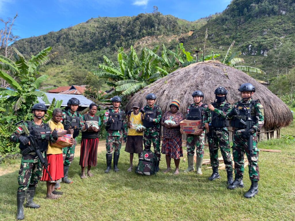 Sebagai bentuk kepedulian terhadap sesama dan berbagi keceriaan Jum’at Berkah, Prajurit Satgas Yonif 721/Mks Pos Balingga dipimpin oleh Serda Syafei dan 10 personel lainnya membagikan sembako dan pelayanan kesehatan kepada warga Distrik Balingga, Kabupaten Lanny Jaya, Papua Pegunungan, Jumat (26/05/2023).