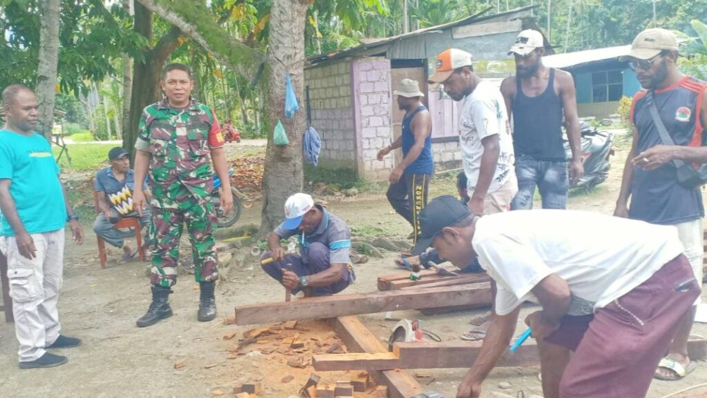 SENTANI – Peduli akan kendala di wilayah binaan, Babinsa Koramil 1701-01/Sentani, Sertu Abdul Azis ikut serta karya bakti pembuatan tiang listrik bersama warga binaan bertempat di Kampung Nolokla Distrik Sentani Timur, Kabupaten Jayapura. Selasa (29/5/2023).