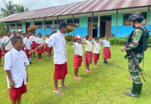 Keerom - Dalam rangka menanamkan jiwa dan semangat perjuangan serta cinta tanah air, Satgas Yonif 143/TWEJ memberikan pelatihan upacara bendera...