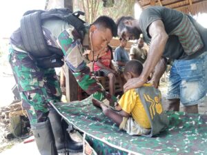 Yahukimo ~ Prajurit Satgas Yonif Raider 200/BN memberikan pelayanan kesehatan gratis kepada warga yang datang berobat di Pos Kekey, Kampung...