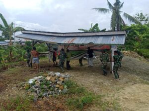 Satgas Yonif 132/BS Bahu Membahu Bersama Masyarakat Bangun Fasilitas Pendidikan Di Perbatasan RI-PNG