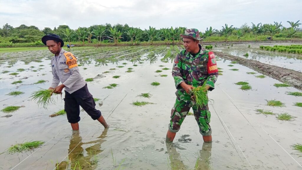 KEEROM – wujud kerja nyata di wilayah binaan, Babinsa Koramil 1701-23/Skanto, Kopda Sukarta bersama dengan Bhabinkamtibmas melaksanakan pendampingan penanaman padi disawah milik bapak Suratno bertempat di Kampung Intaimelyan Distrik Skanto, Kab Keerom. Sabtu (6/5/2023).