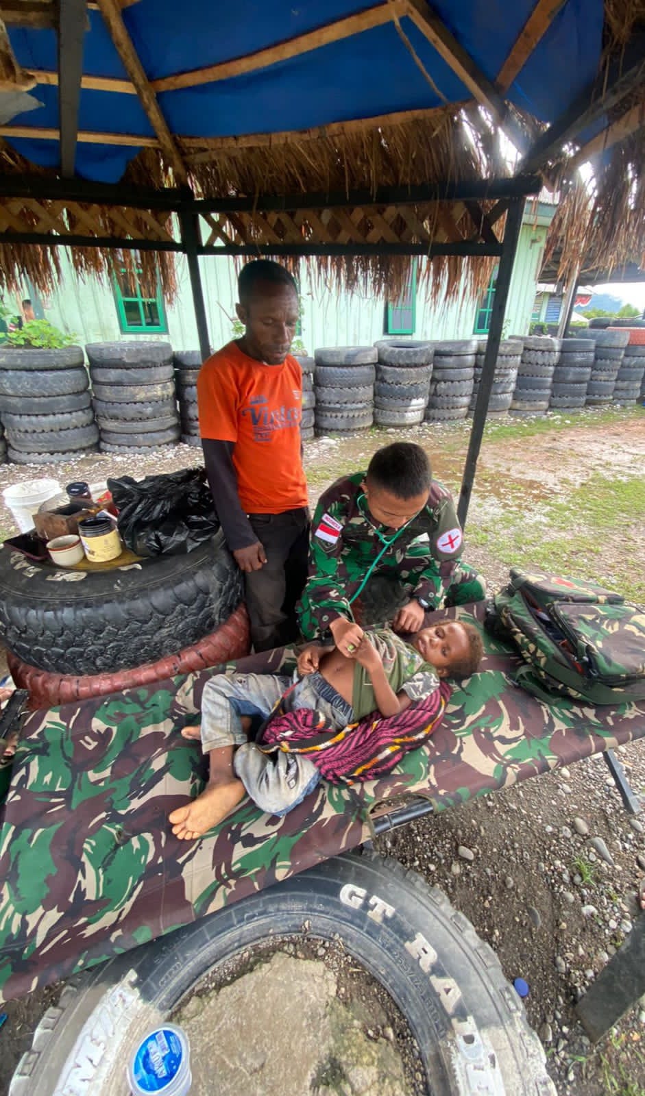 “Hari ini banyak warga berdatangan, salah satunya Bapak Walkon warga Kampung Elelim yang membawa anaknya Karmes Siala yang sakit dengan keluhan panas tinggi disertai batuk dan sudah hampir satu minggu tidak mau makan. Kemudian dengan sigap, anggota kesehatan Pos Elelim Serda Egio selaku Bakes memberikan pengobatan kepada anak tersebut”, terangnya.