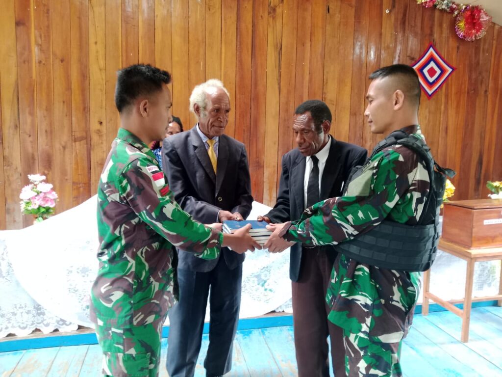 “Saya mewakili jemaat mengucapkan terima kasih atas bantuan Alkitab yang diberikan. Semoga Tuhan memberikan balasan yang baik kepada seluruh anggota Satgas Yonif Raider 200/BN yang sedang melaksanakan tugas,” ucapnya.