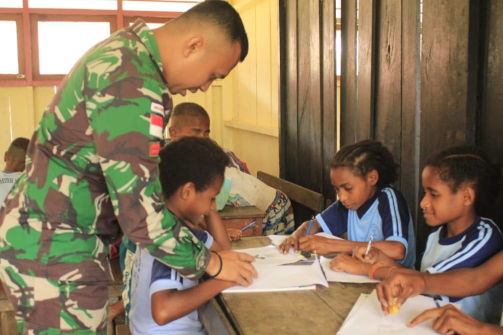 Salah satunya yang dilaksanakan anggota Pos Yabanda yang melaksanakan program bantuan tenaga pendidik guna membantu sekolah yang mengalami kekurangan tenaga pengajar dalam memberikan materi untuk menanamkan nasionalisme dan patriotisme di SDN Inpres Kampung Yabanda, Distrik Yaffi, Kab. Keerom, Papua, Jum’at (16/6/2023).