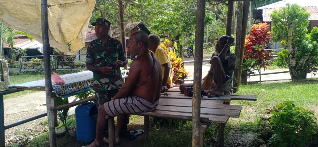 Jayapura – Babinsa Koramil 1701-12/Demta serka Kelliopas melaksanakan komsos dengan bapak Markus Usupar yang merupakan salah satu tokoh adat di kampung Yougapsa Distrik Demta Kabupaten Jayapura, Senin (26/06/2023)