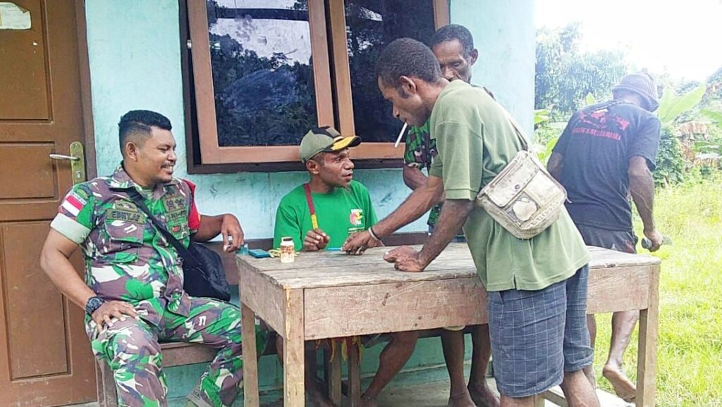 KEEROM – Guna menjaga hubungan baik dengan warga binaan, Babinsa Koramil 1701-05/Waris, Srt Widoyo dan Koptu Fernandus melaksanakan komsos dengan bapak Wensislaus Suwo salah satu tokoh pemuda di kampung Bompay, Distrik Waris, Kab Keerom. Senin (12/6/2023).
