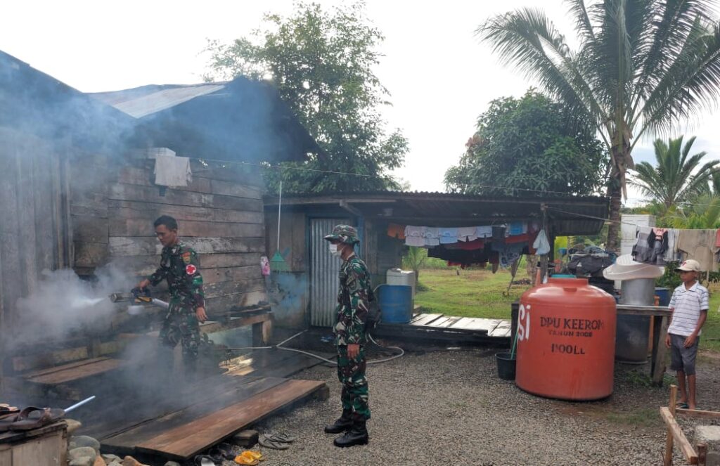 Seperti halnya yang dilakukan para prajurit dari Satgas Yonif 143/TWEJ Pos Senggi yang pada kesempatan ini melaksanakan Fogging guna membantu masyarakat membetantas penyakit malaria di Kampung Senggi, Distrik Senggi, Kab. Keerom, Papua, Minggu (25/6/2023).