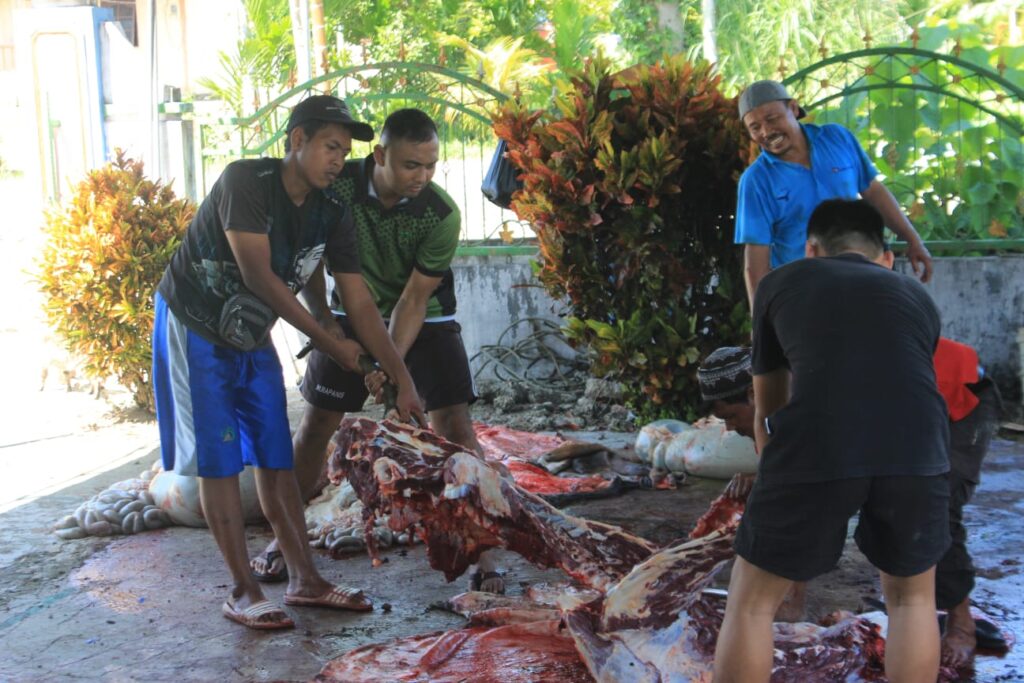 Tidak luput juga dalam kegiatan tersebut personel Kotis membantu kegiatan pemotongan qurban tersebut mulai dari penyembelihan herwan qurban, pemotongan daging hingga pendistribusian.