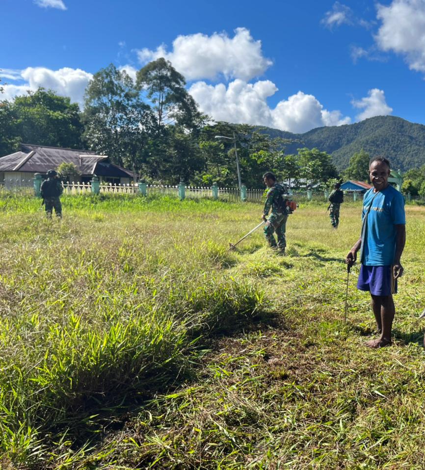 Yalimo ~ Pos Benawa Satgas Yonif Raider 200/BN melaksanakan kegiatan pembersihan lingkungan bersama masyarakat di Kampung Benawa, Distrik Benawa, Kab. Yalimo, Papua Pegunungan, Rabu (14/6/2023).