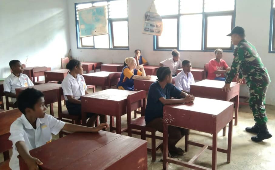 Keerom ~ Kembali Satgas Yonif 143/TWEJ mendatangi sekolah di pedalaman Papua untuk memberikan motivasi kepada siswa siswi SMPN 2 Web di Kampung Yuruf, Distrik Yaffi, Kab. Keerom, Papua, Kamis (8/6/2023).