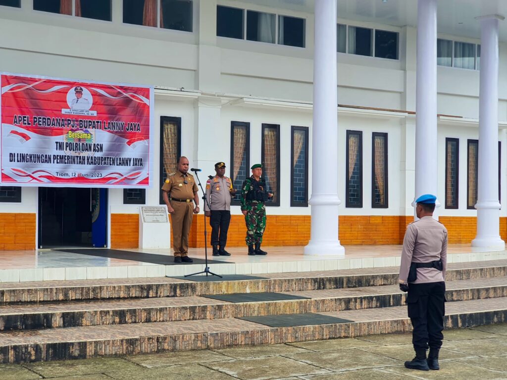Dalam rangka apel perdana Pj. Bupati Lanny Jaya, Satgas Yonif 721/Mks bersama Forkopimda setempat menjalin sinergitas dengan melaksanakan apel gabungan di Kantor Bupati Lanny Jaya, Papua Pegunungan, Senin (12/06/23).