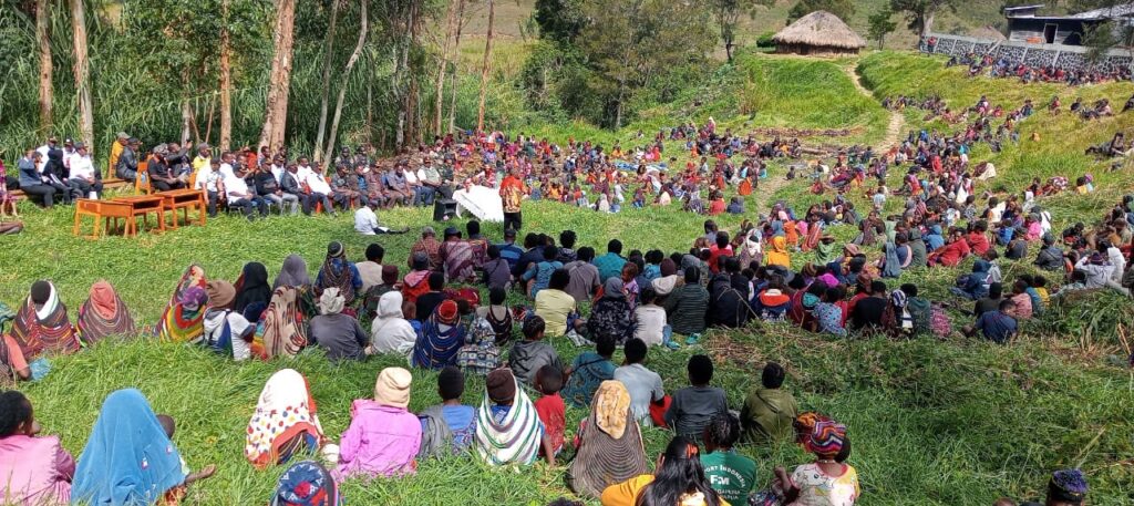 Satgas Yonif 721/Mks Pos Malagayneri bersama Masyarakat Distrik Malagayneri melaksanakan doa bersama diawali dengan acara bakar batu yang merupakan bentuk wujud syukur kepada Tuhan YME dimana daerah tersebut akan dibangun jalan alternatif dari Distrik Malagayneri menuju Distrik Guambali, Kab.Kuyawage, Kamis (15/06/23).
