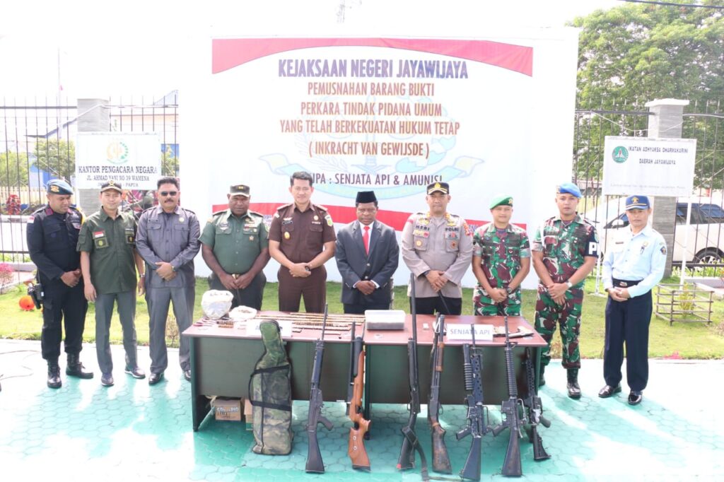 Adapun barang bukti yang dimusnahkan berupa 8 pucuk senjata api, terdiri dari 7 laras panjang dan 1 laras pendek rakitan serta 919 butir amunisi.
