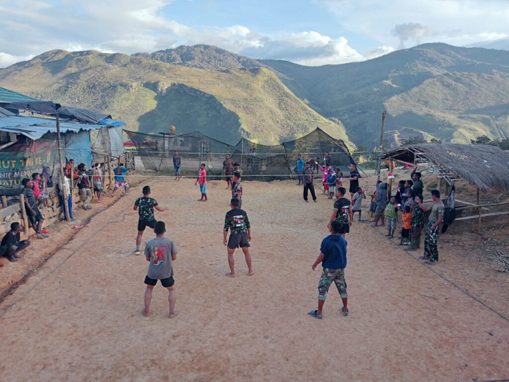 Satgas Yonif Raider 721/Mks Pos Kotis Tiom melaksanakan kegiatan olahraga bola voli bersama dengan masyarakat di Desa Konikme, Distrik Tiom, Kab. Lanny Jaya, Papua Pegunungan, Senin (03/07/23).