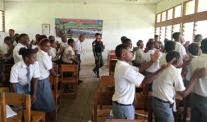 BENTUK KARAKTER SISWA BARU BABINSA KORAMIL 1701-03/ABEPURA LATIHKAN MATERI PBB SISWA SMKN 2 JAYAPURA