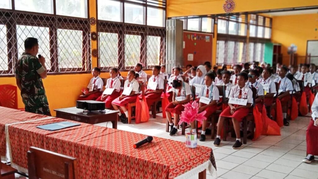 Sentani – Guna membangun dan mengembangkan rasa persatuan dan kesatuan Babinsa Koramil 1701-10/Depapre, Serma Wahyudi dan Sertu Steven Sadam Kmur berikan pengetahuan wawasan kebangsaan dan cinta tanah air kepada para peserta didik baru SMP N 1 Depapre bertempat di Aula Gedung Sekolah SMP Negeri 1 Depapre, Jalan Teluk Waiya Depapre, Distrik Depapre Kab Jayapura. Senin (10/7/2023).