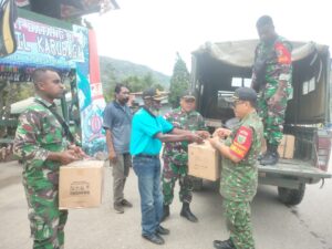 Tolikara ~ Satgas Yonif Raider 142/KJ bersama dengan Koramil 08 Karubaga dan perwakilan Korem 172/PWY membagikan paket sembako kepada Masyarakat...