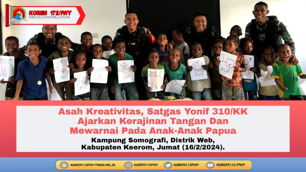 Keerom ~ Untuk mengasah kreativitas dan bentuk mengekpresikan diri pada anak-anak di perbatasan RI-PNG, Pos Somografi Satgas Yonif 310/KK ajarkan kerajinan tangan dan mewarnai gambar di Kampung Somografi, Distrik Web, Kabupaten Keerom, Jumat (16/2/2024).