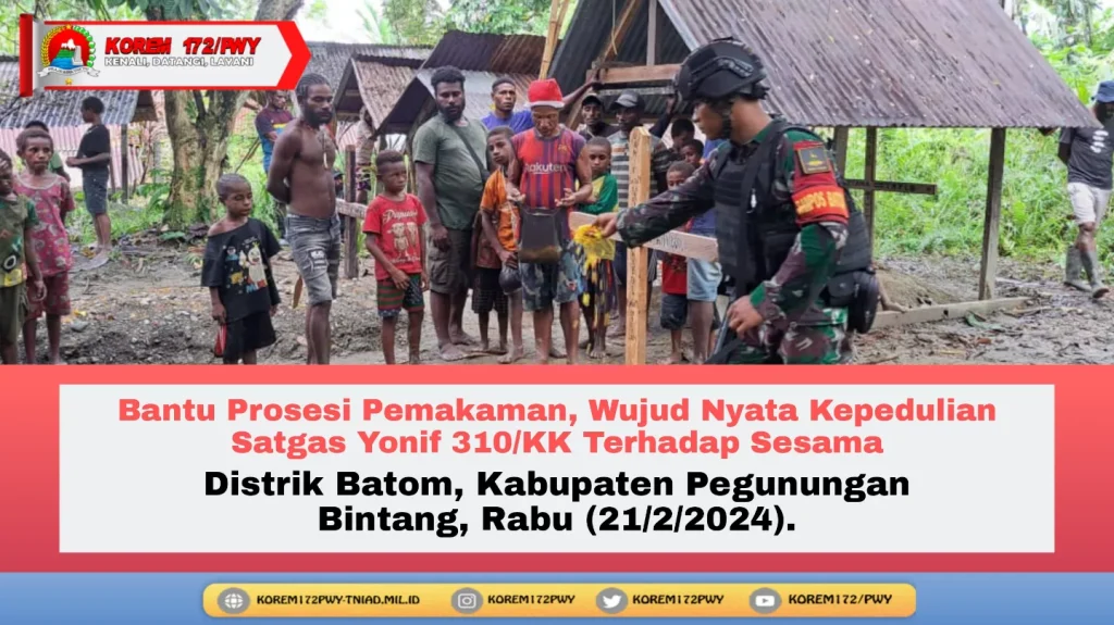 Pegunungan Bintang ~ Sebagai wujud kepedulian serta rasa turut berduka cita, Pos Batom Satgas Yonif 310/KK bantu proses pemakaman jenazah Yanto Prui (34) warga Kampung Batom 1, Distrik Batom, Kabupaten Pegunungan Bintang, Rabu (21/2/2024).