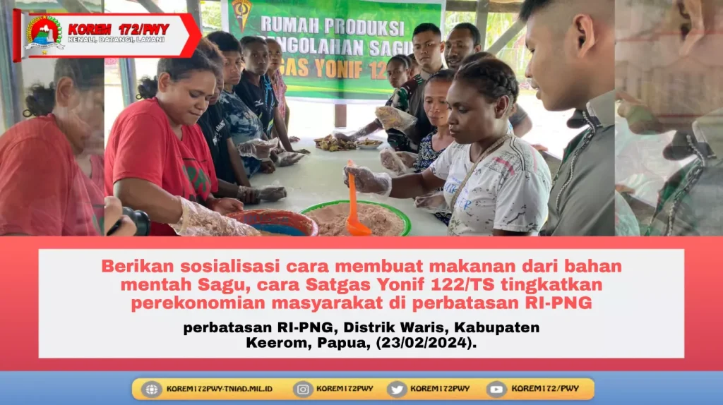 Kabupaten Keerom- Satgas Pamtas RI-PNG Yonif 122/TS Pos Ampas mengajarkan salah satu kuliner olahan dari bahan mentah sagu Kepada masyarakat RI-PNG dengan membuat makanan berupa Lepat pisang sagu, sebagai bentuk upaya Satgas Yonif 122/TS membantu kebutuhan dan meningkatkan perekonomian masyarakat binaan Pos Ampas di wilayah perbatasan RI-PNG, Distrik Waris, Kabupaten Keerom, Papua, (23/02/2024).
