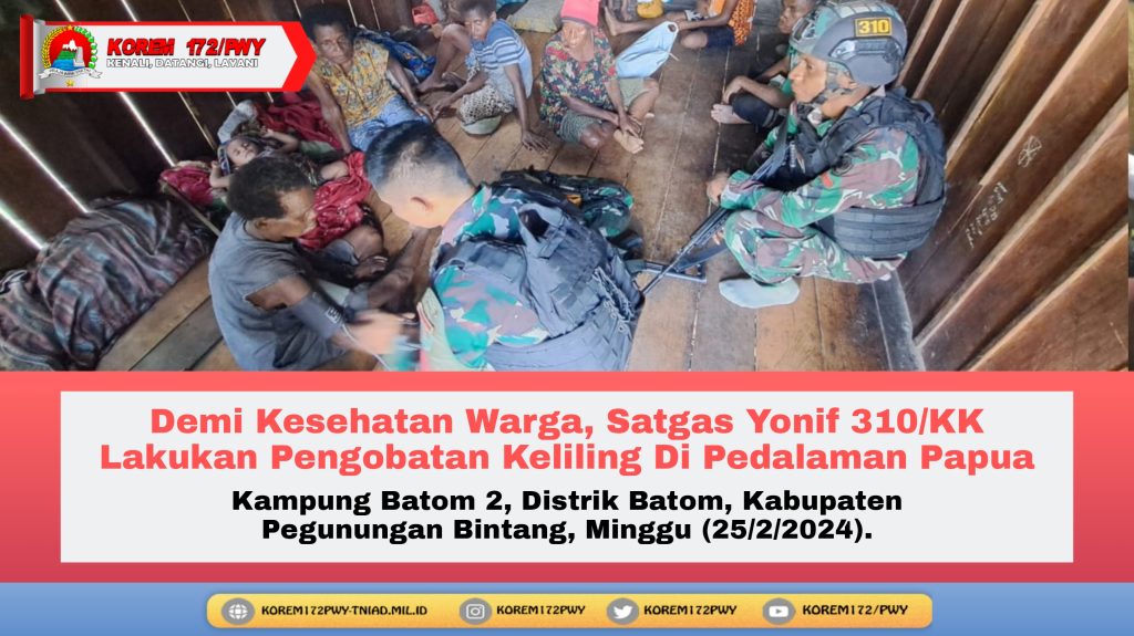 Pegunungan Bintang ~ Sebagai wujud kepedulian dan perhatian terhadap kesehatan masyarakat, Pos Batom Satgas Yonif 310/KK rela keliling Kampung melakukan pengobatan dari rumah ke rumah atau door to door gratis di Kampung Batom 2, Distrik Batom, Kabupaten Pegunungan Bintang, Minggu (25/2/2024).
