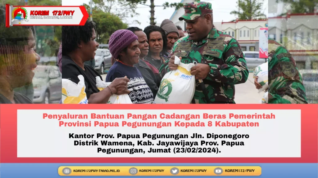 Wamena – Komandan Kodim 1702/Jayawijaya Letkol Cpn Athenius Murip, S.H., M.H., turut serta menghadiri penyaluran bantuan pangan cadangan beras Pemerintah Provinsi Papua Pegunungan Tahun 2024 kepada 8 Kabupaten, bertempat di Kantor Prov. Papua Pegunungan Jln. Diponegoro Distrik Wamena, Kab. Jayawijaya Prov. Papua Pegunungan, Jumat (23/02/2024).