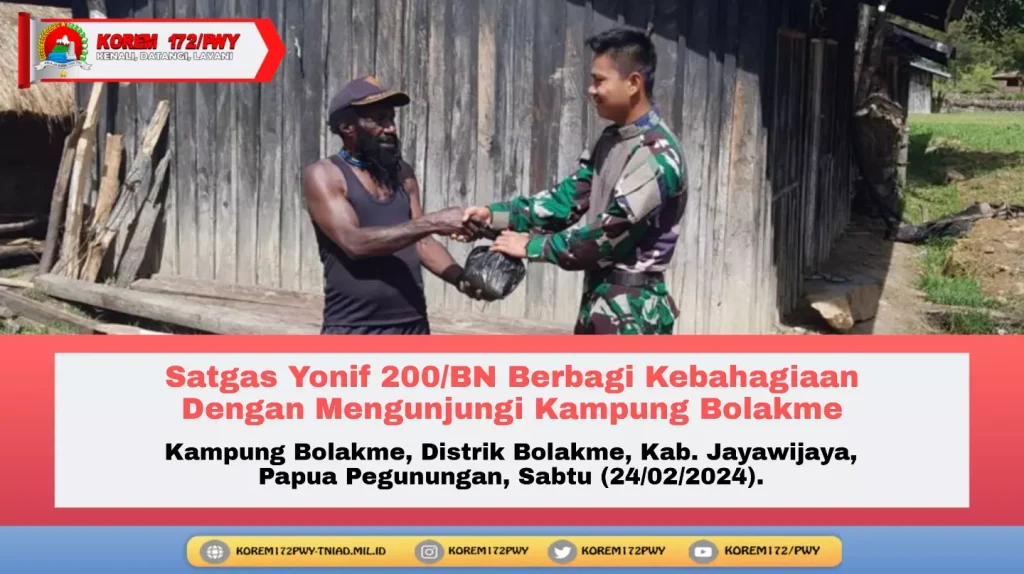 Jayawijaya ~ Satgas Yonif 200/BN melalui Pos Bolakme membagikan sembako kepada masyarakat bertempat di Kampung Bolakme, Distrik Bolakme, Kab. Jayawijaya, Papua Pegunungan, Sabtu (24/02/2024).