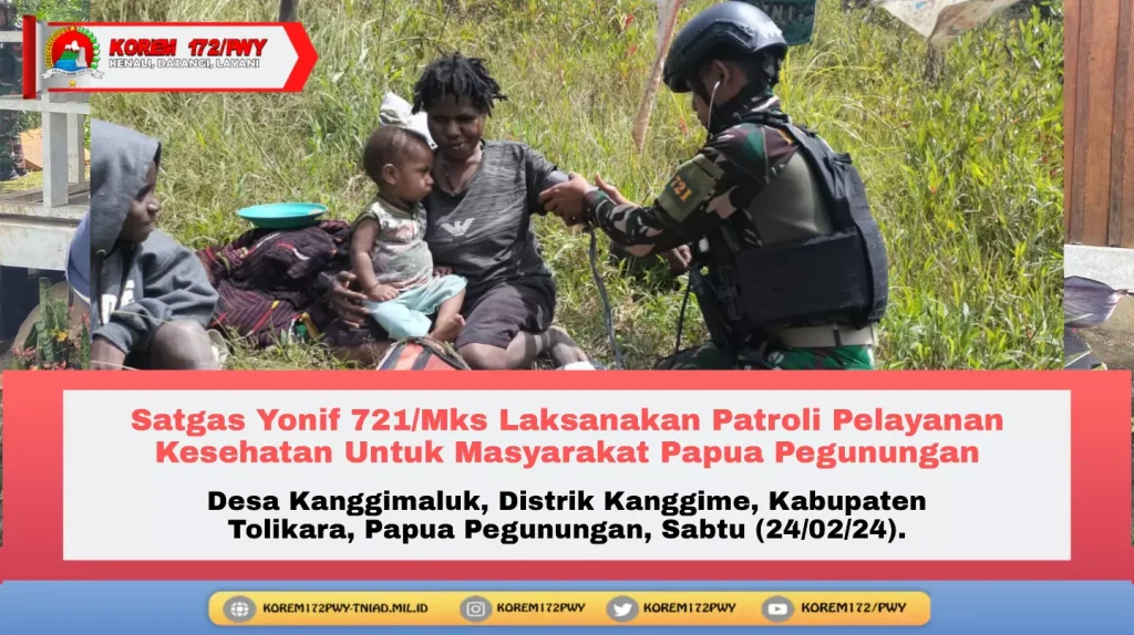 Untuk menjaga hidup sehat masyarakat di Pegunungan Papua, Pos Kanggime Satgas Pamtas Yonif 721/Mks dibawah naungan Kolakopsrem 172/PWY melaksanakan Anjangsana dan patroli pelayanan kesehatan di Desa Kanggimaluk, Distrik Kanggime, Kabupaten Tolikara, Papua Pegunungan, Sabtu (24/02/24).