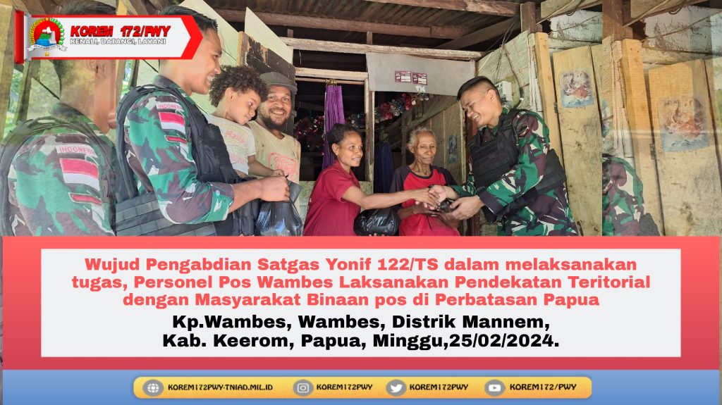 Kabupaten Keerom- Demi terjalinnya hubungan dan komunikasi yang baik dengan masyarakat Personel Satgas Yonif 122/TS Terus melakukan pendekatan kepada masyarakat Kp.Wambes, Wambes, Distrik Mannem, Kab. Keerom, Papua, Minggu,25/02/2024.