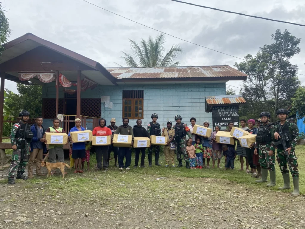 Pegunungan Bintang ~ Sebagai wujud implementasi dari “8 Wajib TNI” yang ke-8 yaitu “Menjadi contoh dan memelopori usaha-usaha untuk mengatasi kesulitan rakyat sekelingnya”, Pos Kotis Oksibil Satgas Yonif 310/KK berikan Bansos berupa paket sembako bagi warga pedalaman Papua di Kampung Imik, Distrik Kalomdol, Kabupaten Pegunungan Bintang, Jumat (8/3/2024).