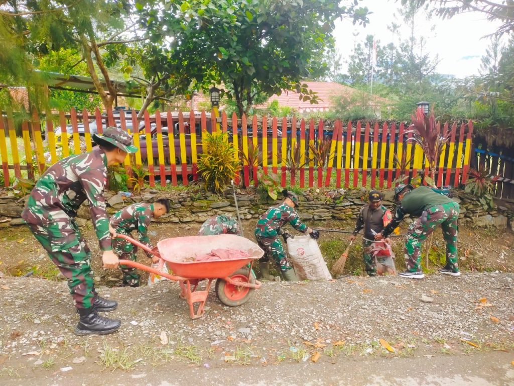 Mamberamo Tengah ~ Satgas Yonif 200/BN melalui Pos Kelila melaksanakan gotong royong bersama masyarakat dalam rangka menciptakan kampung yang sehat dan bersih bertempat di Kampung Kelila, Distrik Kelila, Kab. Mamberamo Tengah, Papua Pegunungan, Kamis (21/03/2024).